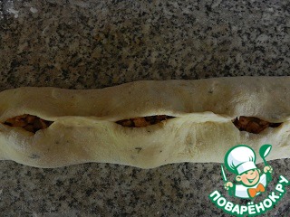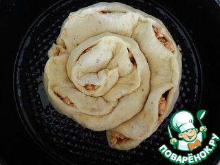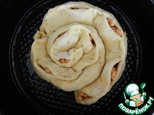 Так поступить со всеми оставшимися частями теста. Получившиеся жгуты выкладывать по спирали один за другим в круглую форму (у меня д=26см) швом наверх.