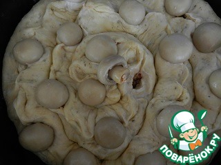 Консервированные грибы (шампиньоны) откинуть на дуршлаг, чтобы стекла жидкость. Грибы вставить в наши "карманчики" по всему периметру пирога.