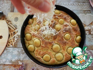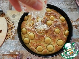 Готовый пирог вынуть из духовки и посыпть сыром, измельченным на мелкой терке (если сыр тугоплавкий, то можно на пару минут вернуть пирог в духовку), а также рубленной петрушкой.