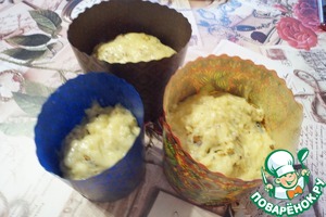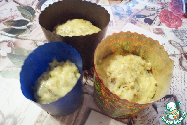 Вмешаем орехи в тесто и распределим его по формам для выпечки. Дадим тесту расстояться 30 минут в формах. Выпекаем куличи в разогретой до 180 градусов духовке. 30- 40 минут. Готовность проверяем шпажкой.