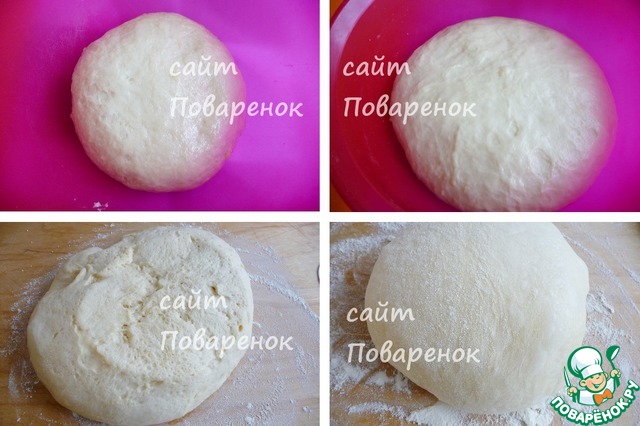 Готовое тесто выложить на рабочую поверхность, припыленную мукой, обмять.