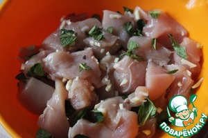 Курицу нарезать кусочками. Мяту и чеснок порубить. Все перемешать и убрать в холодильник на ночь.