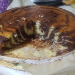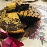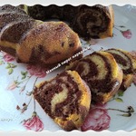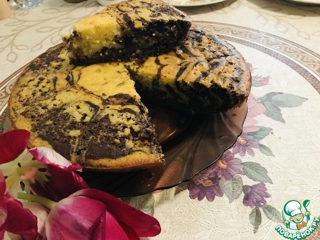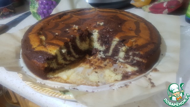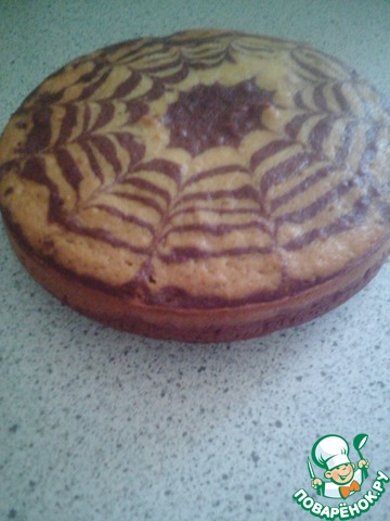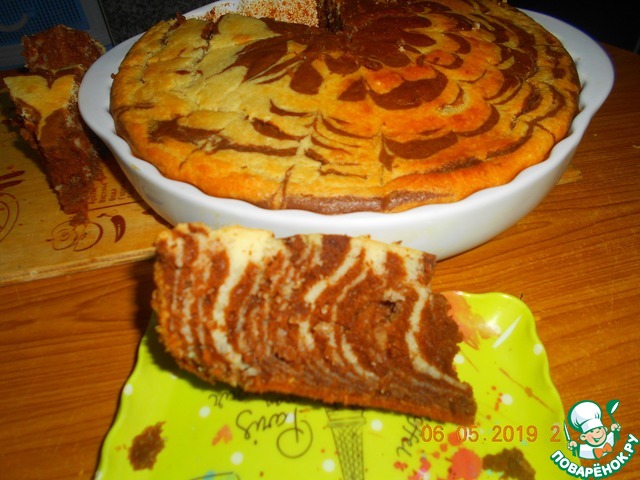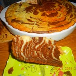 Приступаем к формированию пирога. В смазанную растительным маслом форму (у меня диаметр 22см.) поочередно по 2-3 ст. ложки выкладываем тесто. В конце зубочисткой делаем рисунок по желанию.