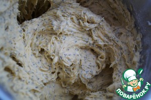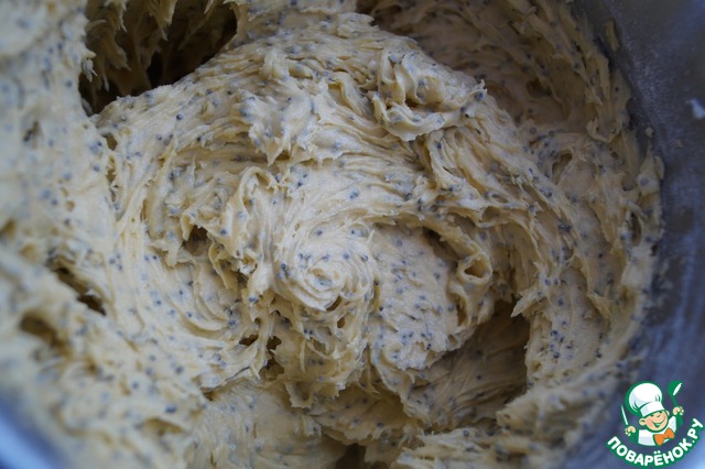 Муку просеять с разрыхлителем и добавить к яично - масляной массе, хорошо взбить и затем добавить мак. Перемешать.