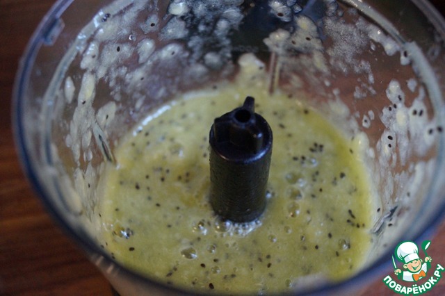 Киви очистить и блендером превратить в пюре. Должно быть 250 гр. Добавить 100 гр сахара и нагреть на огне до полного растворения сахара. Затем всыпать туда желатин и быстро размешать до полного его растворения. Киви при нагревании теряет свой яркий цвет, поэтому я добавила капельку пищевого красителя, но это не обязательно.