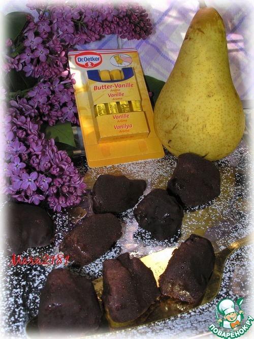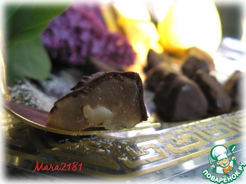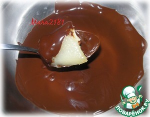 Растопить на водяной бане плитку темного шоколада и каждый кусочек начинённой груши покрыть растопленным шоколадом.