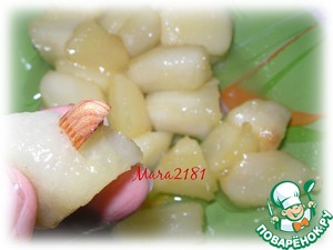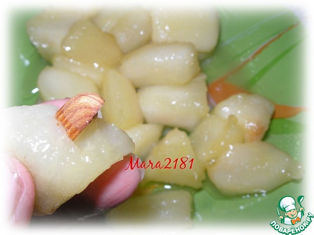 Теперь каждый кусочек груши очень аккуратно начинить половинкой миндаля.