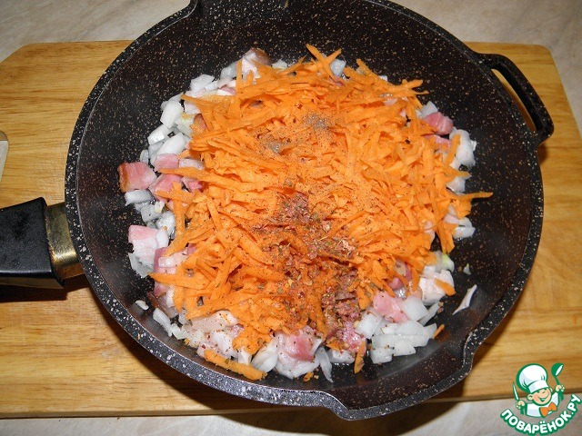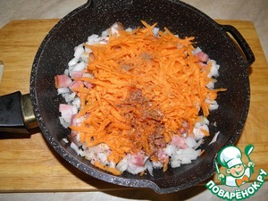 Спустя 5 минут добавляем зажарку и специи. По желанию можно добавить отварные перепелиные яйца