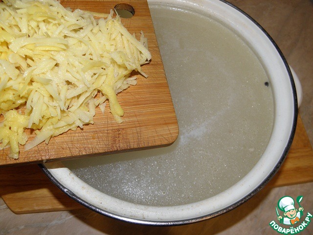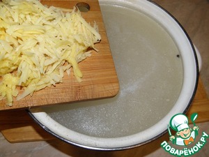 Минут через 7-8 добавляем натертый на терке картофель (он варится у нас в таком виде очень быстро) нельзя переваривать, чтобы не добавлять мутности бульону и чтобы суп не превратился в кашу)