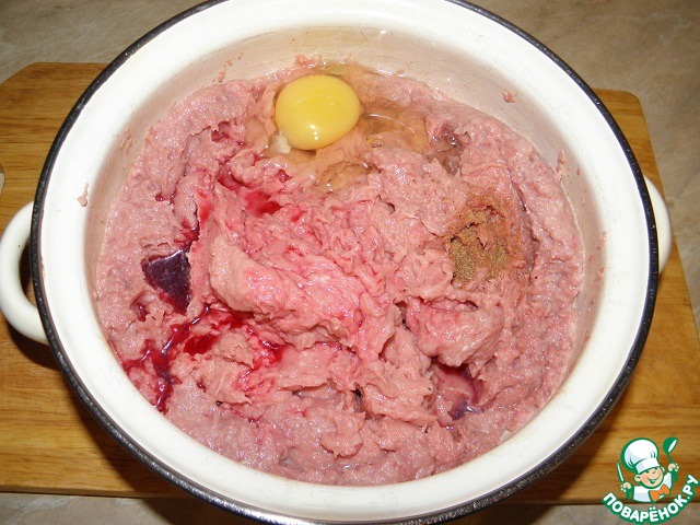 Затем в фарш добавляем мускатный орех, яйцо, свекольный сок и водку. (небольшая добавка алкоголя не влияет на вкус, он полностью выпаривается в процессе приготовления)