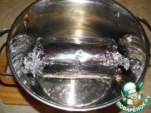 После того кастрюлю ничем не накрываем, делаем средний огонь, вода нагревается до 70-75-80% (Варить колбасу в более горячей воде нельзя, поскольку мясной белок сворачивается при 45–50 градусах, а дальше происходит процесс пастеризации продукта) Время приготовления приблизительно 1,5 часа. Во время варки надо перевернуть рулет 1 раз на другой бок.