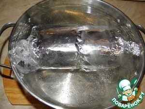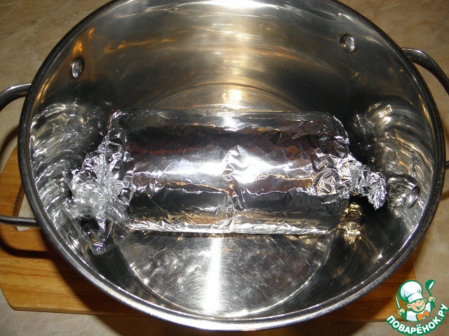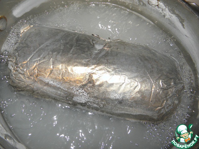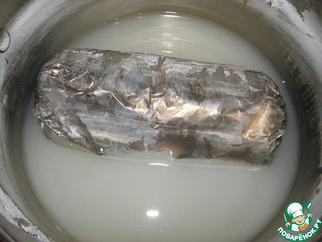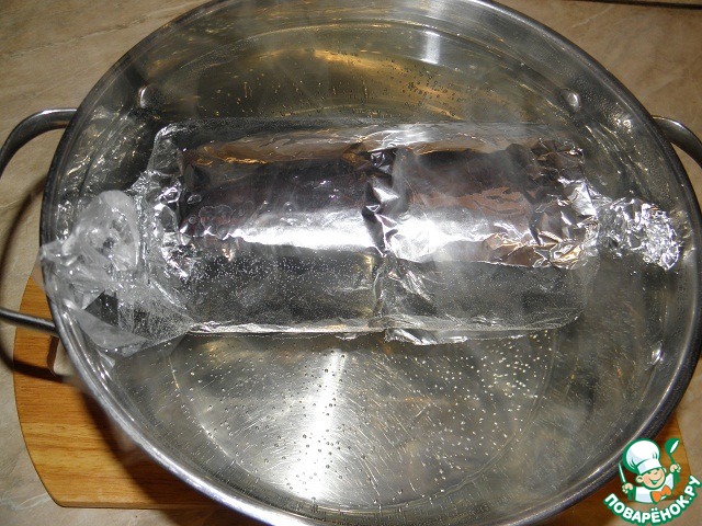 Наливаем воду в кастрюлю на высоту 15см, даем ей закипеть и погружаем туба наш рулет ( в кипяток)