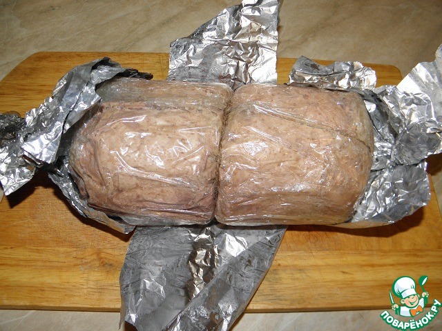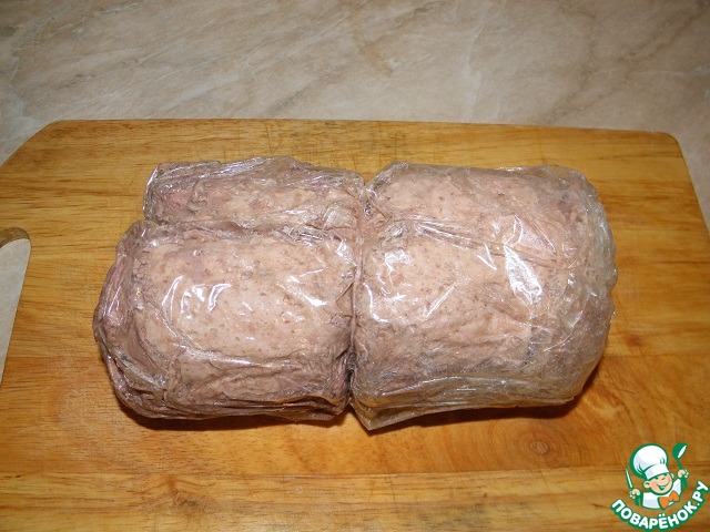 Перекладываем фарш в пакет и формируем форму толстой колбасы. Для этой процедуры вообще используются пакеты для запекания, пекарская и пищевая бумага, фольга и полиэтиленовые пакеты- ( знаю много противников последних))) так что выбирайте на свое усмотрение)