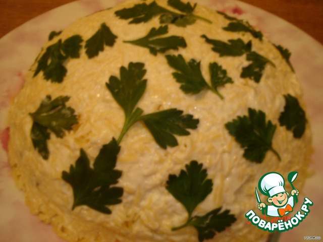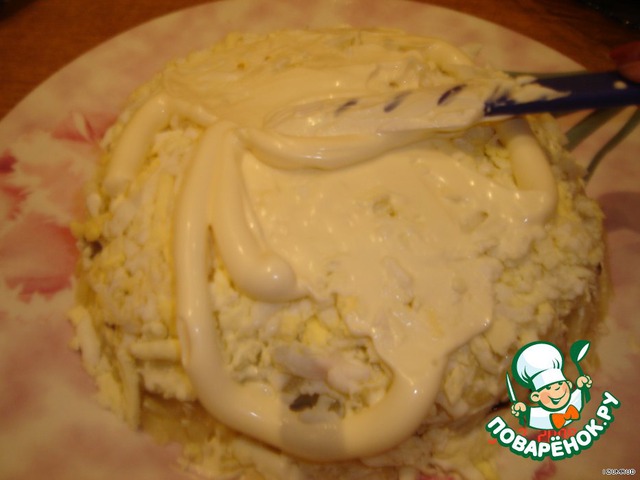 Филе курицы отварить, покрошить и выложить первый слой в форме круга, пропитать майонезом