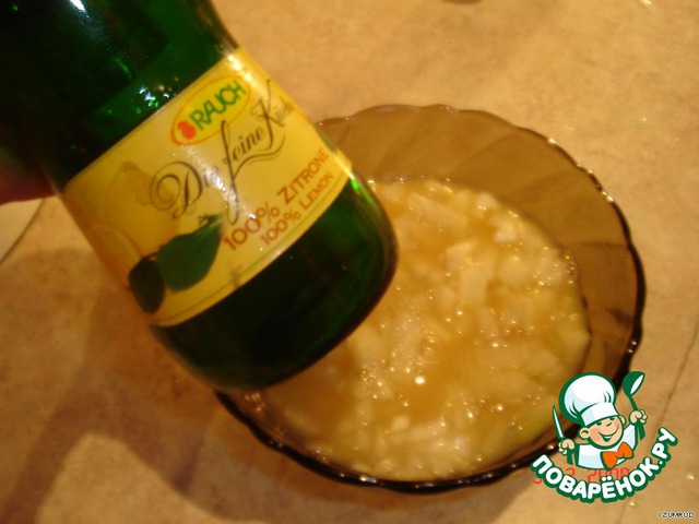 Лук замариновать на 20 мин. в лимонном соке и откинуть на дуршлаг