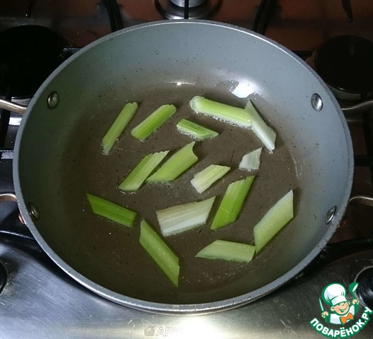 Сковороду ставим на огонь, наливаем немного подсолнечного масла и начинаем обжаривать сельдерей.