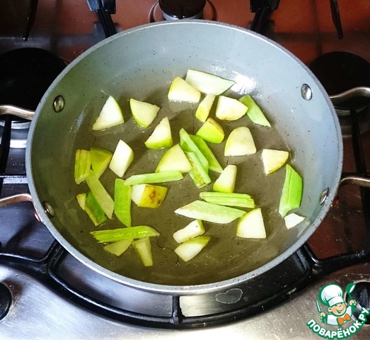 Когда сельдерей немного схватится, добавляем яблоки. Обжариваем овощи, периодически помешивая, до карамелизации яблок. Яблоки должны чуть-чуть поджарится.