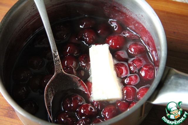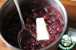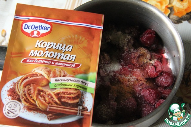 Смешать вишни с сахаром, специями и водой. Поставить на средний огонь, довести до кипения и проварить.