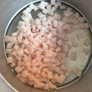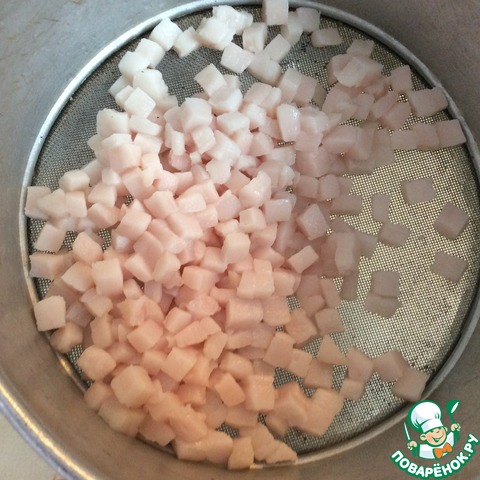 Ошпариваем кубики сала и перемешиваем, чтобы каждый кубик был "помыт". Теперь жир не будет "выпадать" из колбасы.
