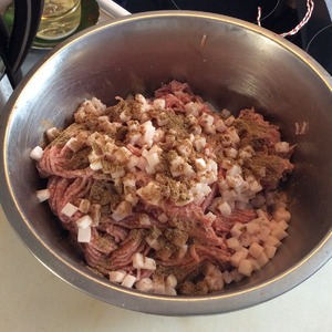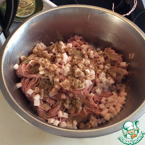 Созревший фарш пропускаем через мелкую решётку ещё раз, можно и третий, но я не делаю - фарш очень тягучий. Боюсь мясорубка не сдюжит. Добавляем специи и сало. Вымешиваем, стараясь не размазать кубики сальца. Можно просто сначала промешать со специями. Но я уже убыстряю.