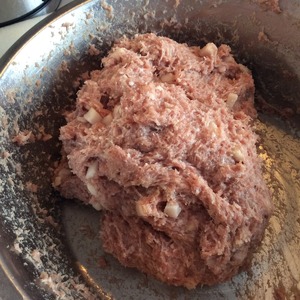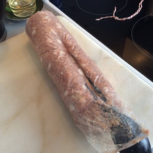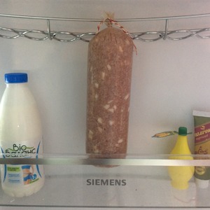Вот таким образом, готовят колбасы сервелатного типа, там вода не добавляется, а хорошо перемешанную мясную массу добавляется для рисунка - шпик, резанная грудинка или свинина.