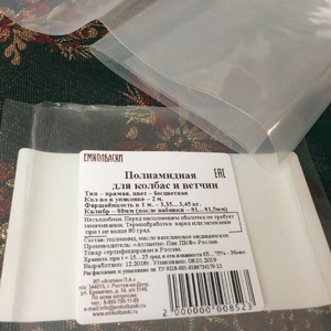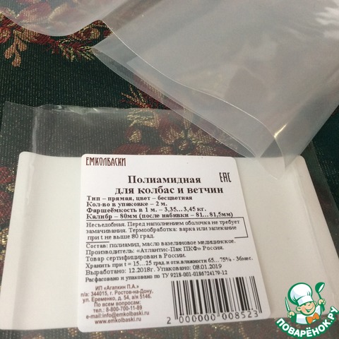 Приготовим полиамидную оболочку диаметр 80 мм: завяжем один кончик. Понадобилось 45 см. В коллагене готовлю иные колбасы, меньшего диаметра. Коллаген менее прочный, по-моему, и капризный. Однако колбаса в нем наряднее и ароматнее однозначно!