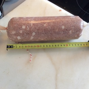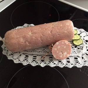 Долго, вкусно, красиво. В составе только мясо. С неё начинала. Получилась с первого раза. Чайная, потому что на бутерброды к чаю! Только сегодня не до шуток: "колбасня" - дело серьёзное! И обязательно нужна оболочка (лучше полиамидная).
