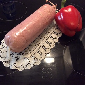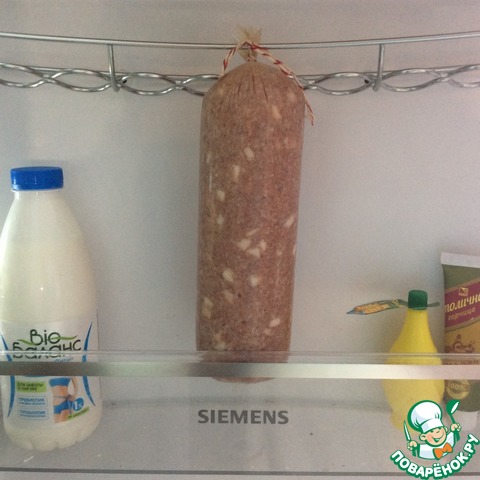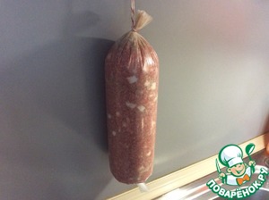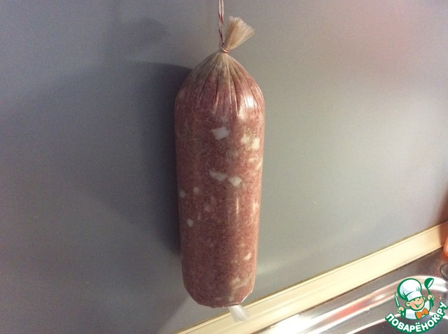 Перед варкой отепляем колбасу при комнатной температуре около 2-3 часов. При необходимости перевязываем хвостик для большей плотности после осадки фарша в оболочке.