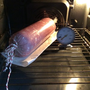 Такой батон можно "обжарить" в духовке при 85гр в течении 40-60 минут, до появления красной корочки, затем снизить температуру до +80-85гр