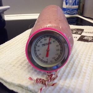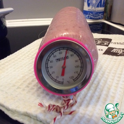 Далее по теории при температуре 80' по 1 минуте на мм диаметра + 20 минут. У меня диаметр 80-82 мм. т. е. 1 час 40 минут. Температуру повышаем постепенно. На этом этапе ставлю поддон с водой и регулирую стабильность температуры периодическим включении конвекции. Через 1 час 20 минут температура внутри колбасы у меня бывает лишь 60'. Проверяем температуру внутри батона: она должна быть 70' (меня через 2 часа 10 минут).