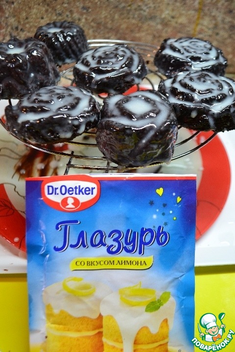 Растопить шоколад и с помощью кисточки покрыть глазурью остывшие кексы.