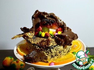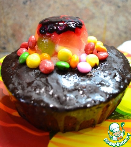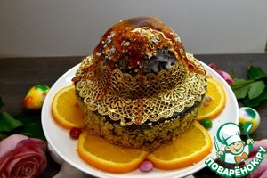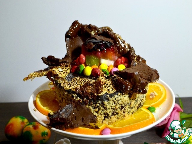 На кулич выложить одну из заготовок желе, вкусные яркие конфеты и накроем шоколадной сферой. Украсим молотыми орешками, съедобным золотым кружевом по желанию. -