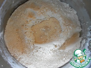 Сделать в центре углубление. Насыпать туда накрошенные живые дрожжи, налить 3 ст. л. теплого молока. И поставить на теплое место на 20 минут.