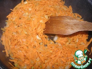 Добавляем натертую морковь, специи и сахар (сахара приблизительно 1 ч. л, можно чуть больше, в общем, зависит от вашей томатной пасты)