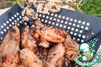 Далее разложить куриные крылышки на решетку и готовить до румяности на углях.