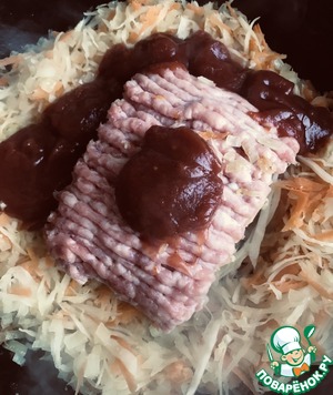 Добавляем томатную пасту, фарш. Перемешиваем.