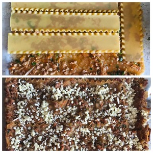В противень наливаем виду. Духовку греем до 180 градусов. Форму с лазаньей накрываем фольгой и убираем в духовку, предварительно разместив в противне. Выпекаем накрытой 20 минут, затем снимаем фольгу, щедро посыпаем сыром и убираем ещё на 20 минут, не накрывая.