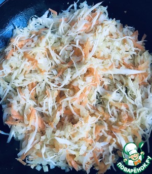 На сковороде обжариваем капусту, затем добавляем лук, морковь. По вкусу чеснок. Специи. Протушиваем до полуготовности.