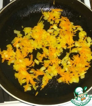 На растительном масле поджарить до прозрачности лук, добавить морковь. Жарить до мягкости моркови. -
