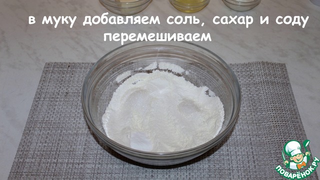 В муку добавляем соль, сахар и соду. Перемешиваем хорошо.