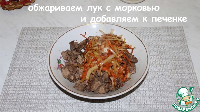Обжаренную печень выкладываем в тарелку и даем немного остыть. Нарезаем небольшими кусочками.
