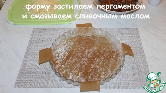 Форму застилаем пергаментом и смазываем сливочным маслом.
