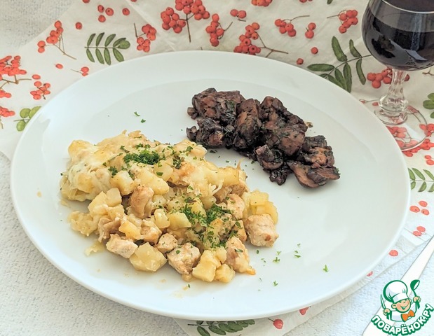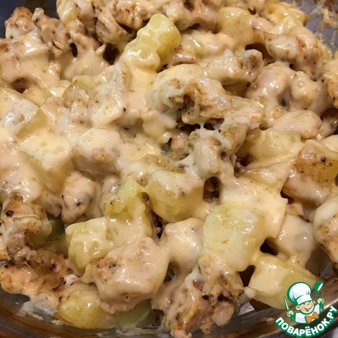 • Молодая пикантная картошечка с курочкой готова, при подаче можно добавить сметану, ещё сыр и свежую зелень.