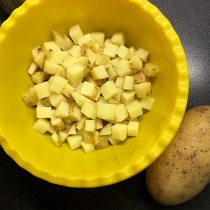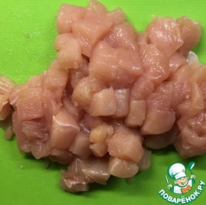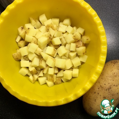 • Картошечку хорошо моем и вместе с молодой кожицей нарезаем кубиком 1x1 см.