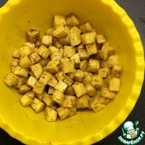 • Добавляем к нарезанной картошке 1 ст. л. растительного масла, специи и соль, хорошенько перемешиваем.