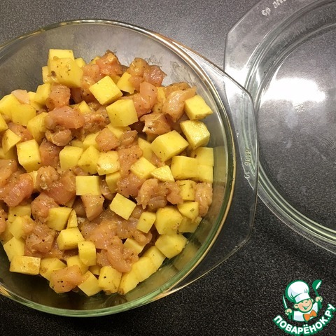 Распределяем картошку с курицей в форме, накрываем крышкой (если ее нет - фольгой), готовим в заранее разогретой духовке 200 градусов - 50 минут.