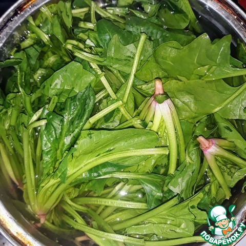 Залить шпинат водой, довести его до кипения и проварить 2 минуты. Затем слить воду и измельчить шпинат в блендере.
