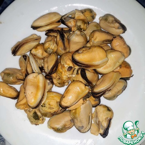В другой кастрюле довести воду до кипения, уменьшить огонь и высыпать туда мидии. Проварить их 2 минуты и сразу же вытащить чтобы они не стали резиновыми. Итого вышло 150 грамм.