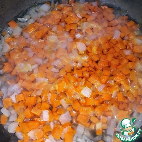 Нарезать кубиками морковь и лук, влить воду на сковороду и высыпать нарезку туда. Протушить овощи под крышкой около 7 минут.