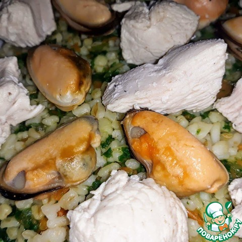 Булгур с мидиями, курицей и овощами